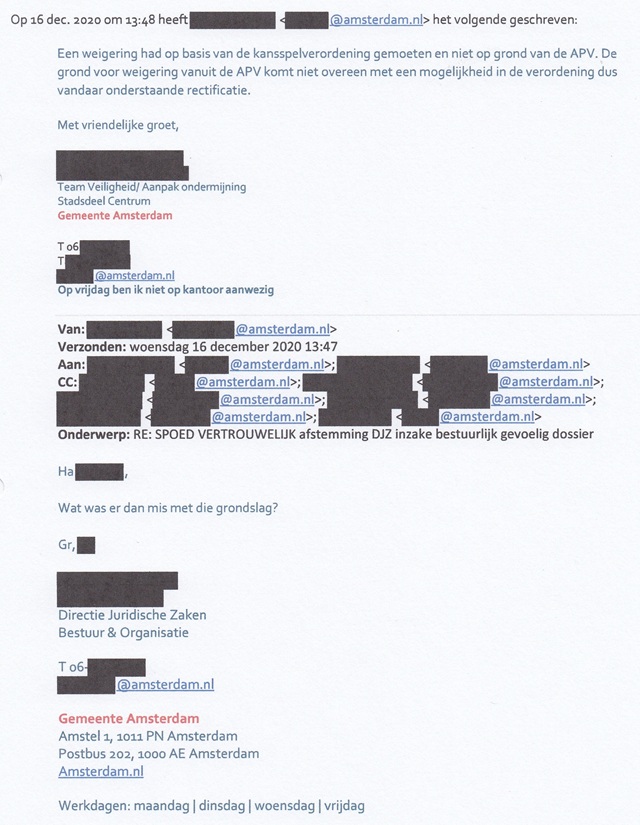 Het voornemen moet daarom worden ingetrokken. DJZ snapt het niet. ‘Wat is er dan mis met die grondslag?’ vraagt DJZ aan Team Veiligheid. Een minuut later krijgt DJZ antwoord: ‘Een weigering had op basis van de kansspelverordening gemoeten en niet op grond van de APV. De grond voor weigering vanuit de APV komt niet overeen met een mogelijkheid in de verordening’.