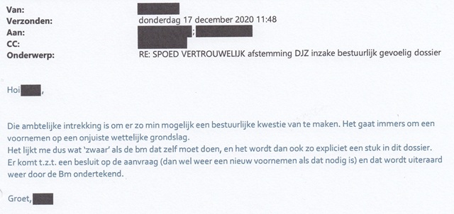 ‘Prima, dan gaan we het zo regelen. Je krijgt zo een aangepaste oplegger met de brief die dan door de burgemeester ondertekend kan worden,’ reageert het team bestuursrecht. Het is nog steeds donderdag 17 december 2020.