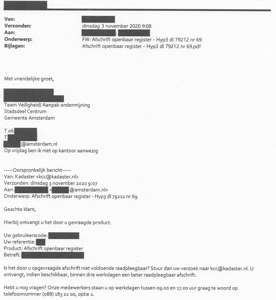 Op 28 oktober 2020 legt het OM in verband met de nieuwe strafzaak beslag op mijn panden. Dinsdagochtend 3 november 2020 mailt het Kadaster aan Team Veiligheid/Aanpak ondermijning (hierna: Team Veiligheid) ‘Hierbij ontvangt u het door u opgevraagde product’. De ambtenaar van Team Veiligheid ontvangt een afschrift van de beslaglegging uit het openbare register. Slim. Dan kan later in de correspondentie met de ondernemer keurig worden verwezen naar ‘gegevens uit het openbare Kadaster’ en niet naar het OM als bron waar de informatie over de beslaglegging oorspronkelijk vandaan komt.
