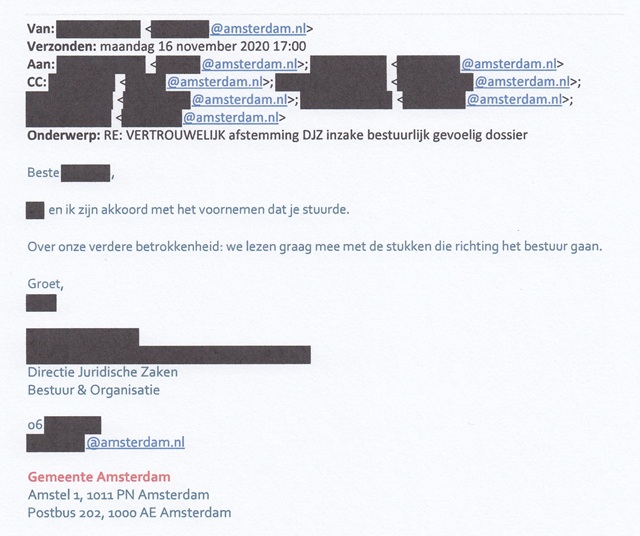De medewerker van Team Veiligheid vervolgt: ‘Met OOV is afgesproken dat zij het voornemen voorlegt aan de BM voor ondertekening volgende week. Ik heb vandaag ook woordvoering BM en SDC geïnformeerd. De stadsdeelvoorzitter van SDC is reeds op de hoogte. Ik zie graag jullie reactie maandag tegemoet.’