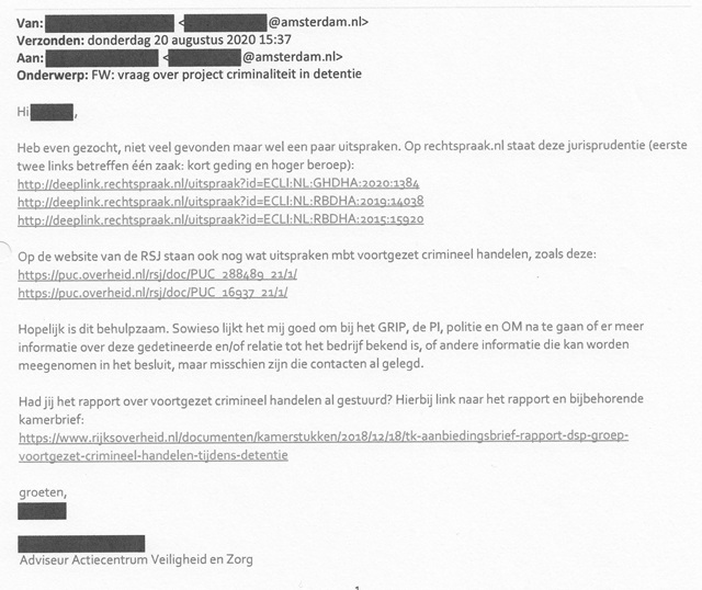 Op een vraag ‘over project criminaliteit in detentie’, stuurt de Adviseur Actiecentrum Veiligheid en Zorg op 20 augustus 2020 diverse links van uitspraken in zaken waarin ‘voortgezet crimineel handelen’ een rol speelt.
