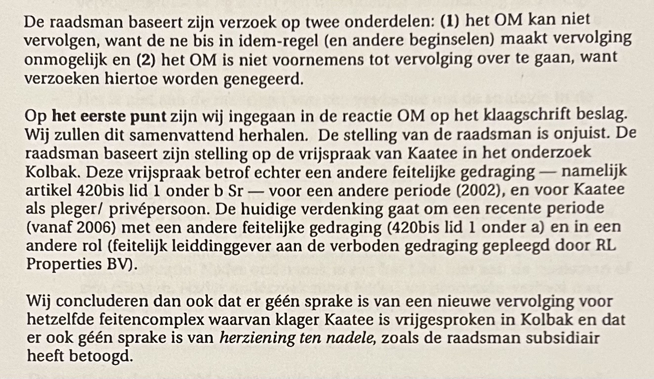 ‘Deze vrijspraak (in Kolbak) betrof een andere feitelijke gedraging – namelijk artikel 420bis lid 1 onder b Sr. – voor een andere periode (2002), en voor Kaatee als pleger/privépersoon. De huidige verdenking gaat om een recente periode (vanaf 2006) met een andere feitelijke gedraging (420bis lid 1 onder a) en in een andere rol (feitelijk leidinggever aan de verboden gedraging gepleegd door RL Properties BV).’